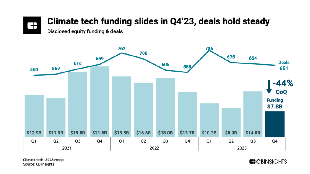Funding to climate tech companies continued to trend down in Q4’23, despite deal counts remaining steady.