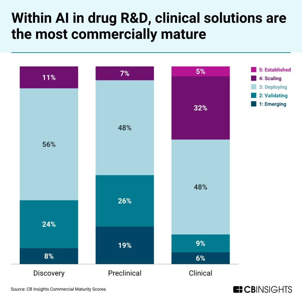Clinical development AI tools have achieved commercial maturity, while preclinical applications offer emerging investor opportunities