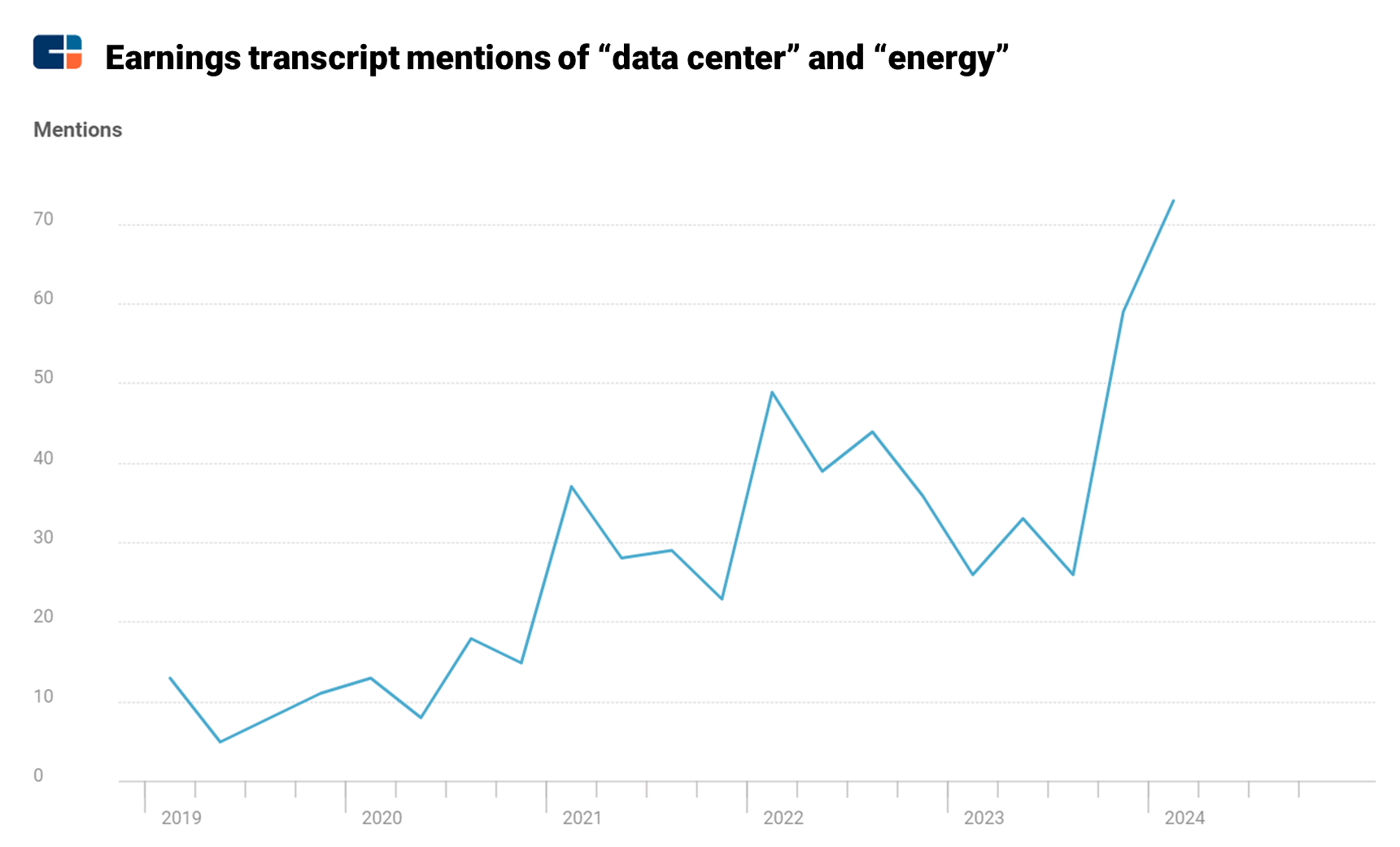 Corporations are starting to pay more attention to this issue — discussions of data center energy usage on earnings transcripts are trending up quickly.