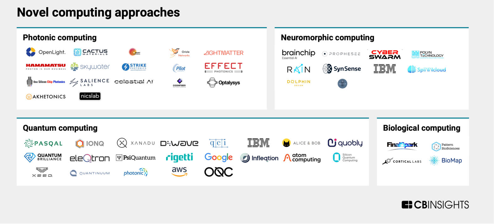 In this brief, we break down 4 novel computing approaches that show promise for AI workloads, as highlighted in our recent market map: photonic, neuromorphic, biological, and quantum computing.