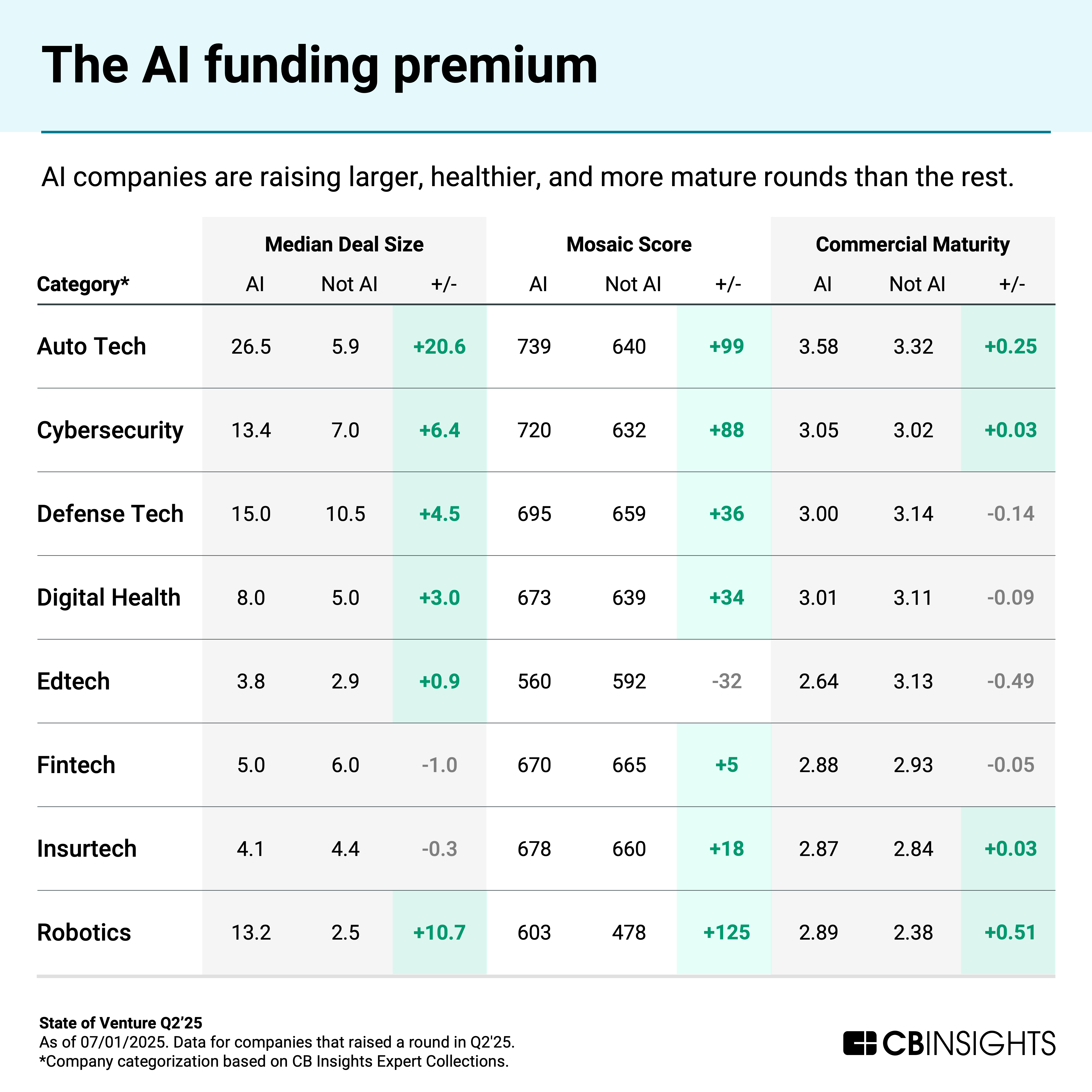 But the premium isn’t just financial. AI companies also score higher on CB Insights’ Mosaic Score (success probability) and Commercial Maturity (ability to compete and partner) across most sectors, signaling stronger fundamentals and market readiness in the eyes of investors.