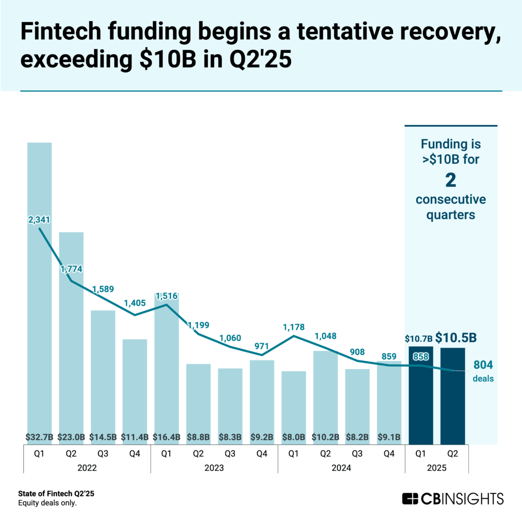 For the first time since early 2023, fintech funding has exceeded $10B for 2 consecutive quarters.