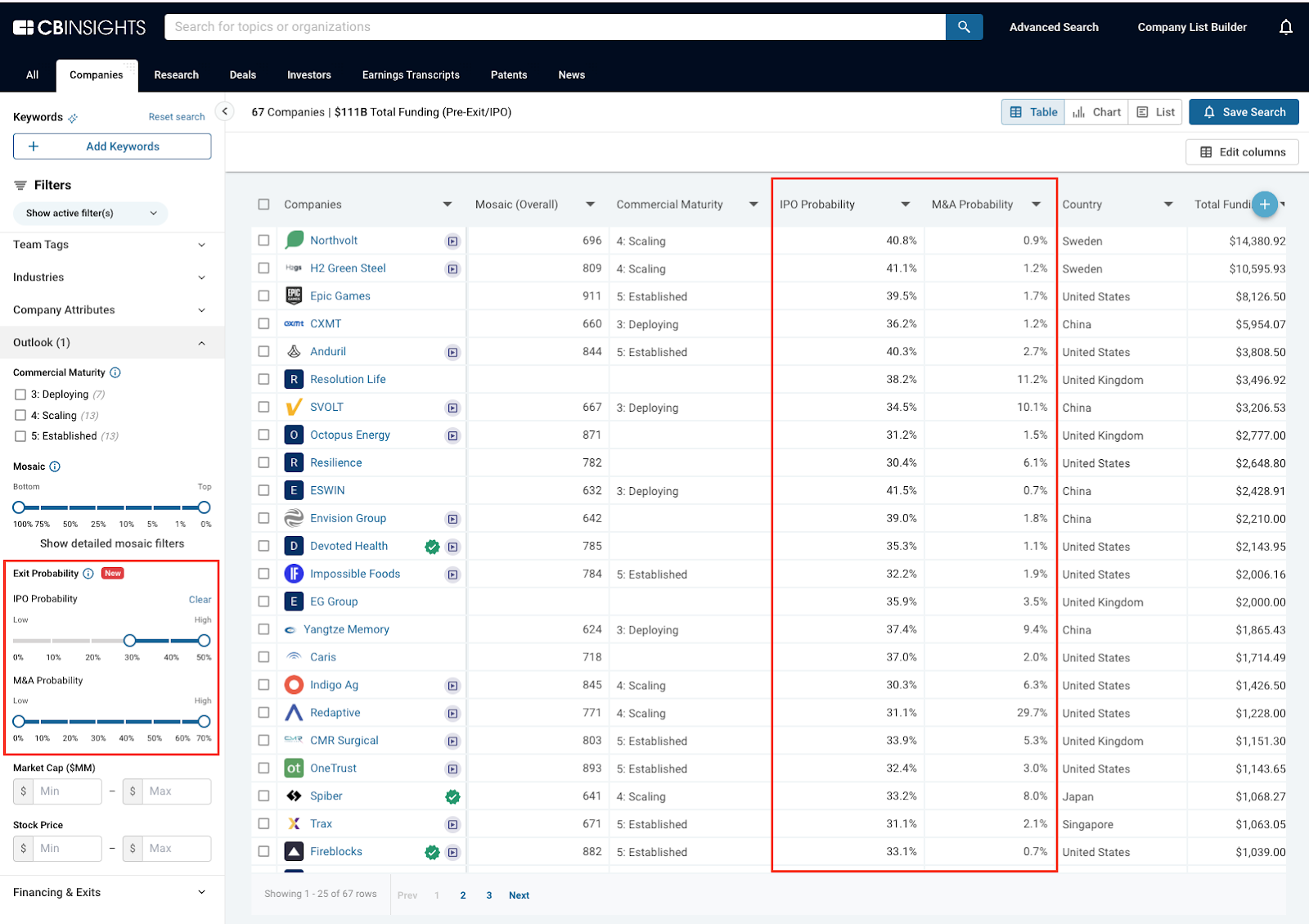 CB Insights Exit Probability is a proprietary machine learning algorithm that measures a private company’s chance of an IPO or M&A exit within the next 2 years.