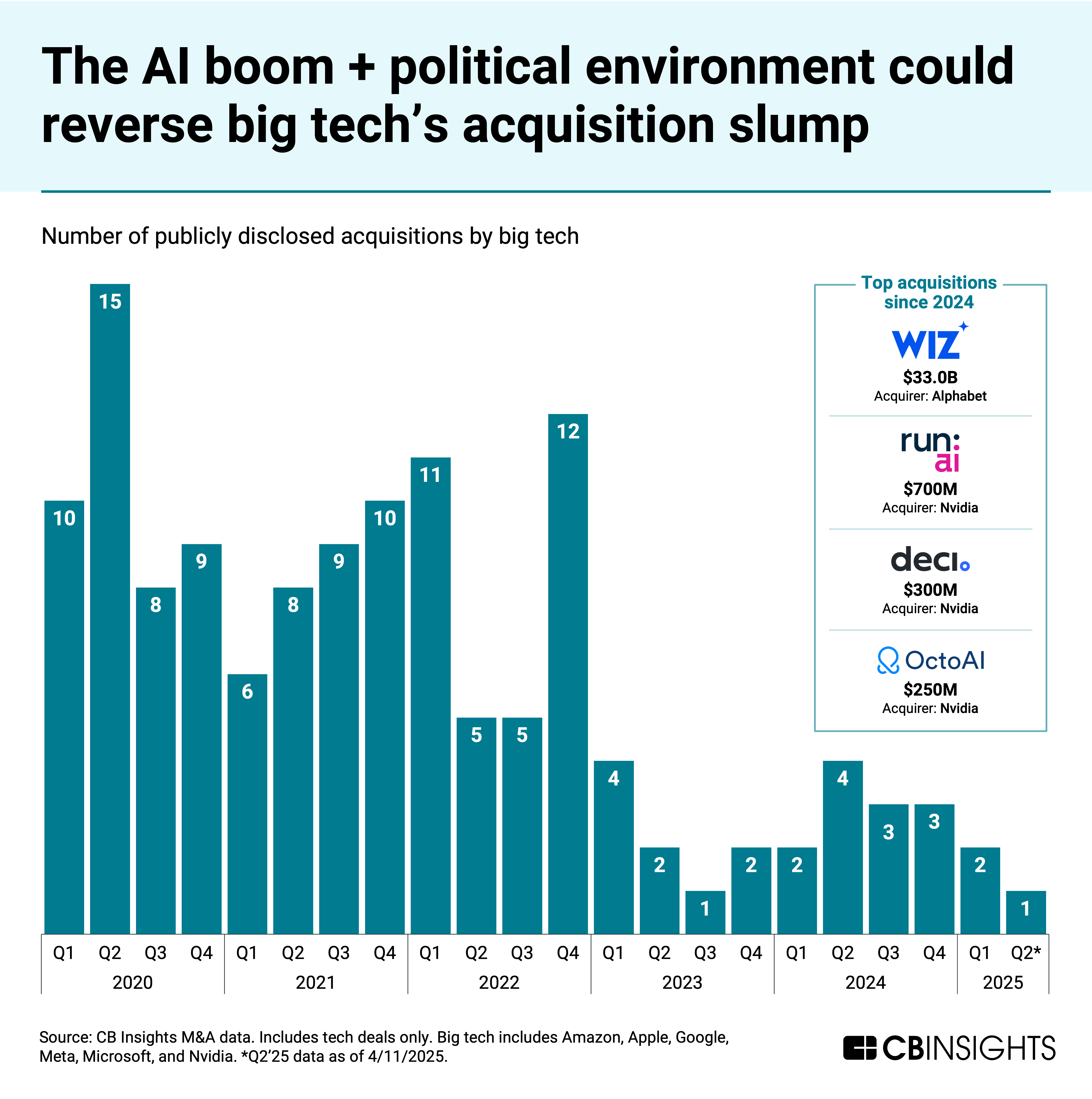 Notably, Google parent Alphabet announced a $33B acquisition of cloud security firm Wiz in March — the biggest VC-backed M&A exit ever. It’s also the first billion-dollar big tech acquisition since 2023, when Microsoft’s Activision deal closed.