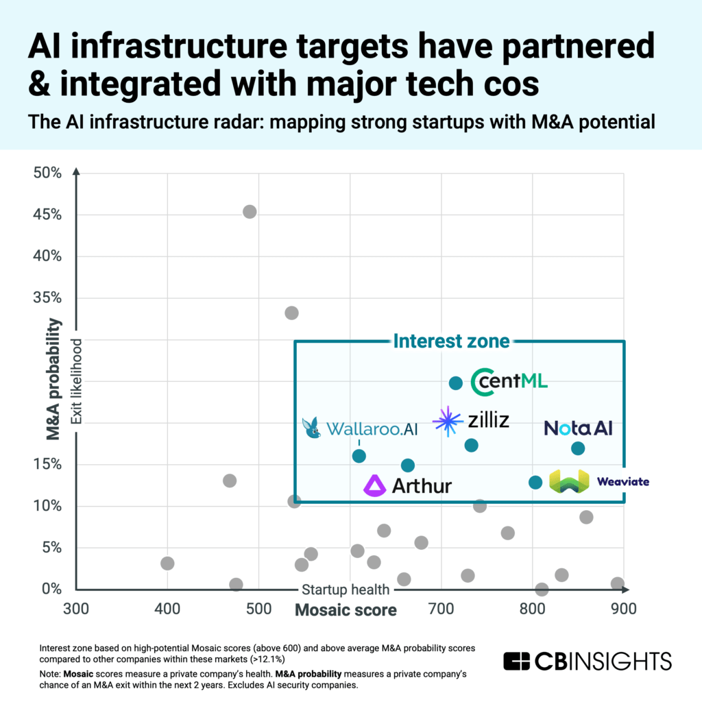 - Enterprise tech heavyweights compete for AI infrastructure dominance: We’re already seeing strong signals from cash-rich companies such as Cisco and IBM, which are future-proofing their business models with AI investments. Hardware-aware AI optimization players CentML and Nota AI — which help accelerate AI model deployment while reducing compute costs — appear in our AI infrastructure acquisition target list. These companies have already shown quantifiable efficiency improvements as well as validation from Nvidia as a partner or investor.