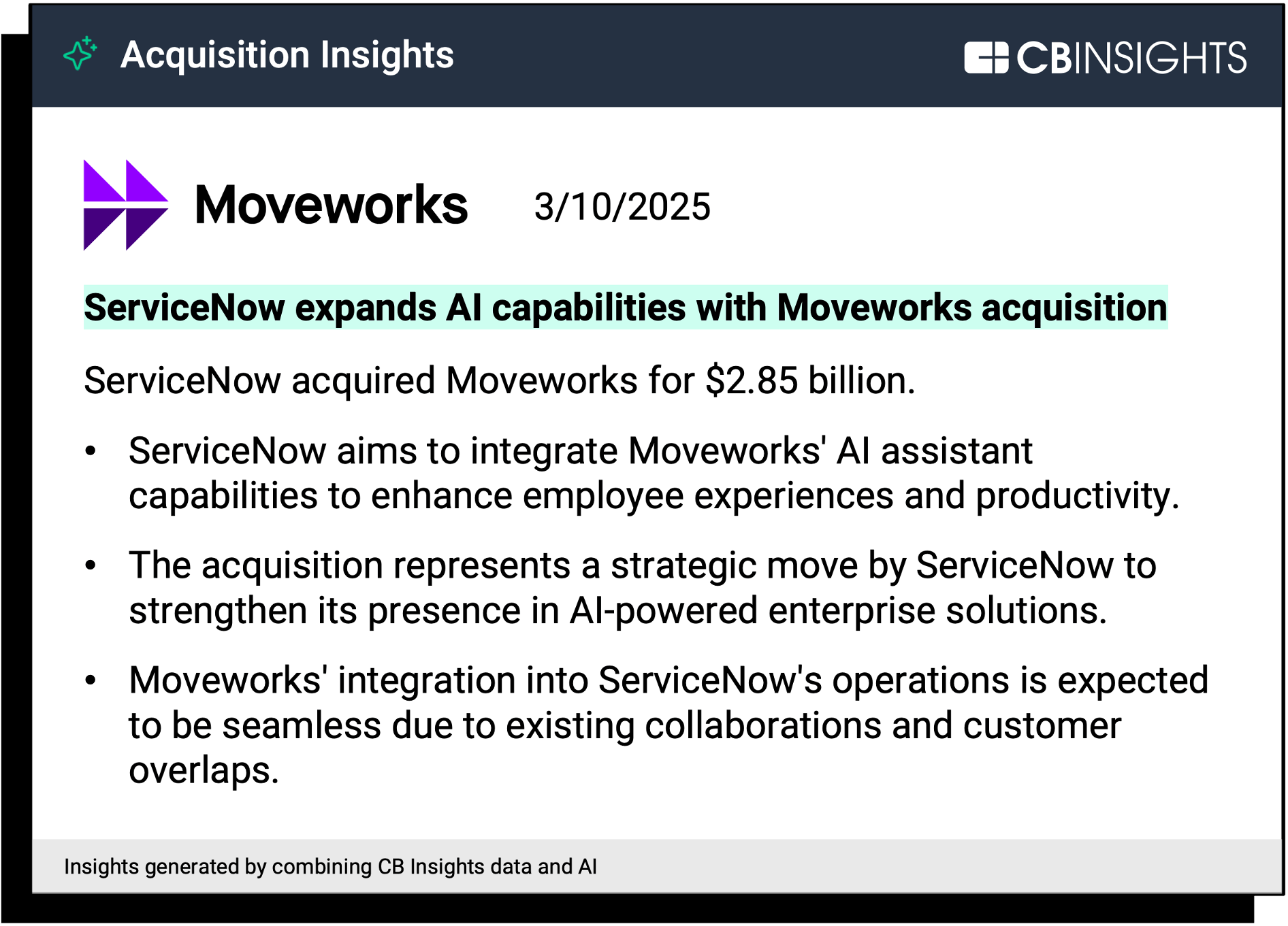 - SaaS giants fortify their offerings with AI agent acquisitions: While some believe AI agents signal the death of SaaS companies, we anticipate SaaS leaders will acquire AI agent companies to avoid disruption. We’re already starting to see this happen with ServiceNow acquiring Moveworks for close to $3B in March 2025.