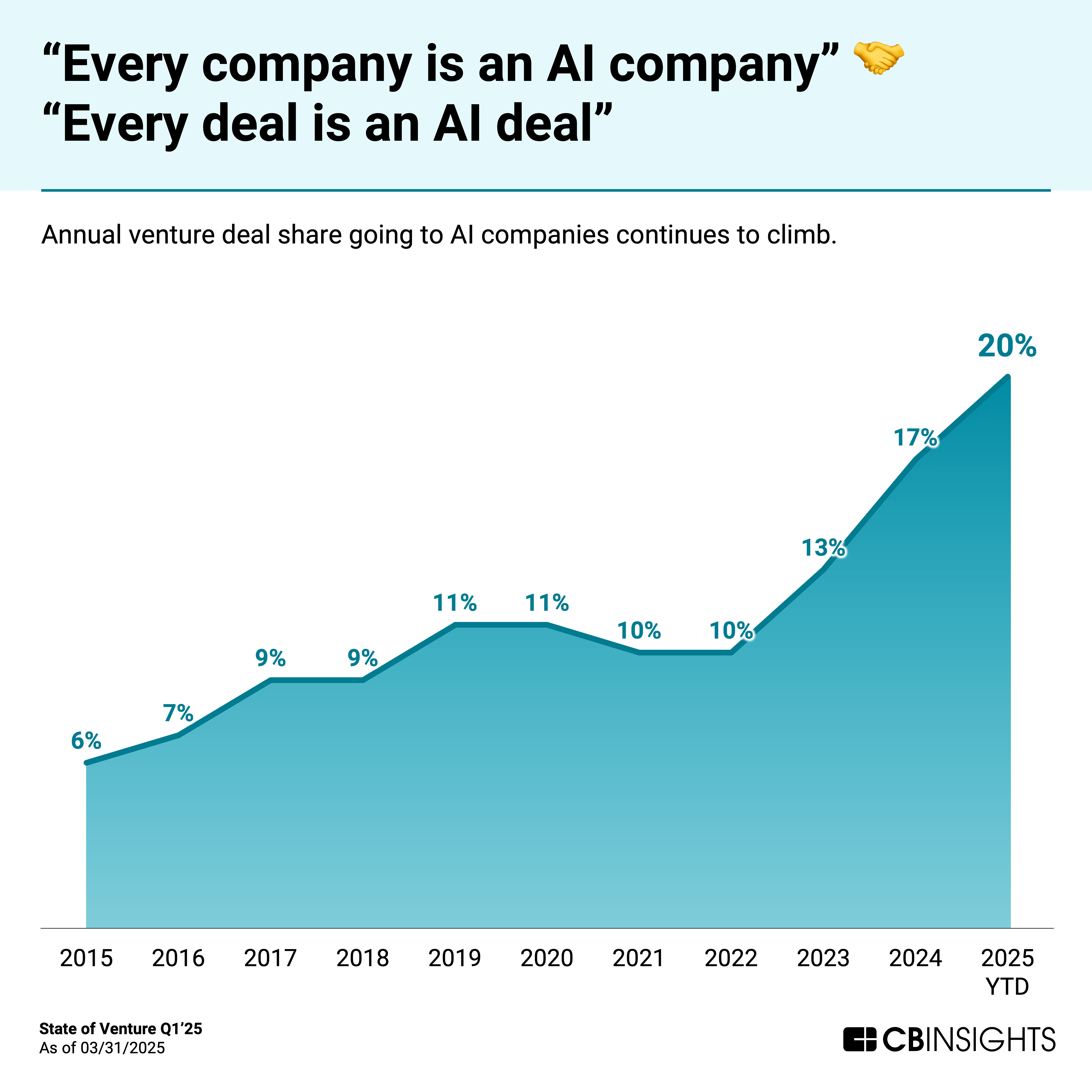 In absolute numbers, AI companies secured 1,134 deals in Q1’25 — a 7% decline from the previous quarter but still the fourth straight quarter with over 1,100 AI deals.