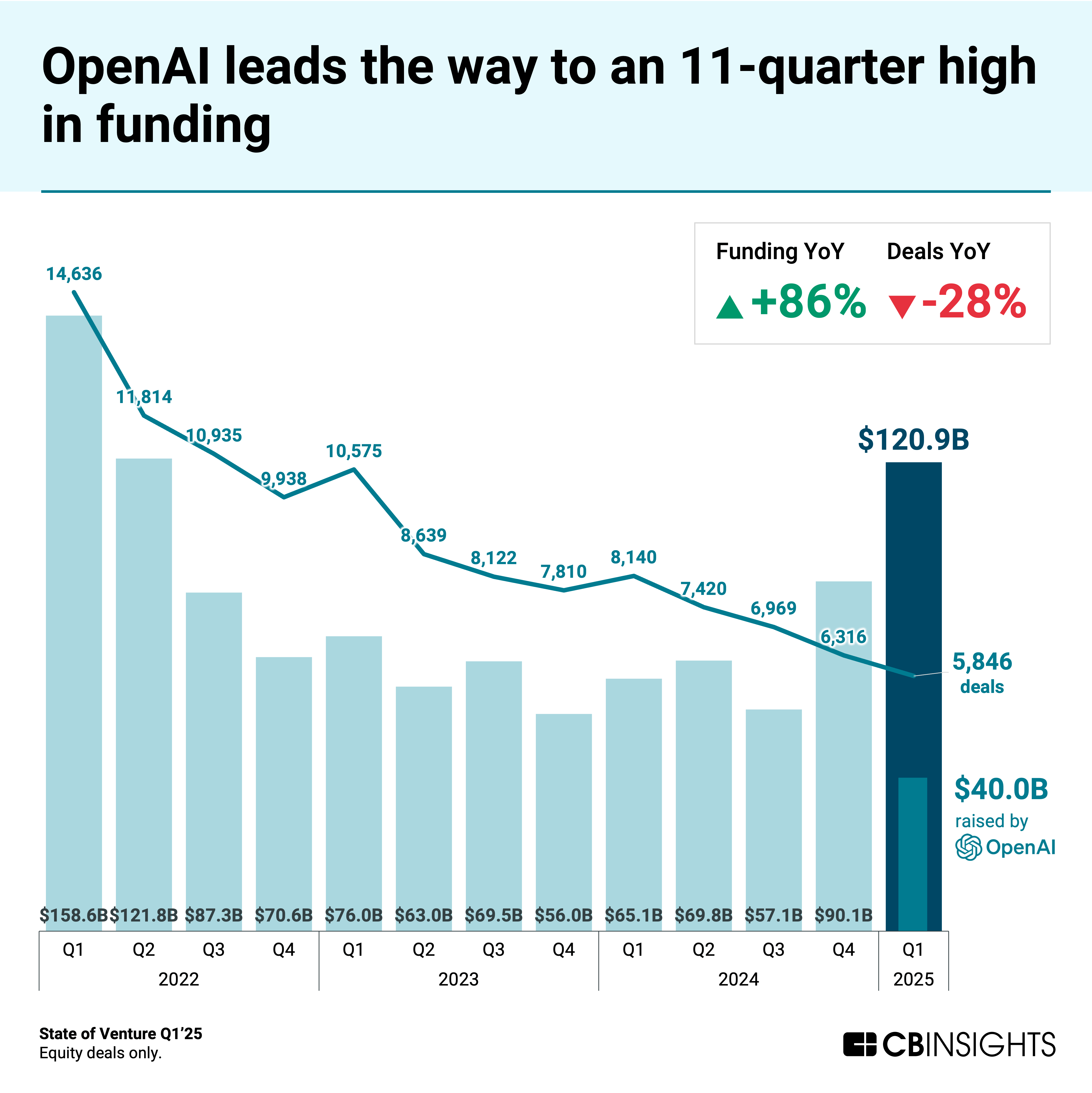 Venture capital funding reached the highest level in nearly 3 years in Q1’25 — led by OpenAI’s mammoth $40B round — as AI continues to reshape the venture ecosystem.
