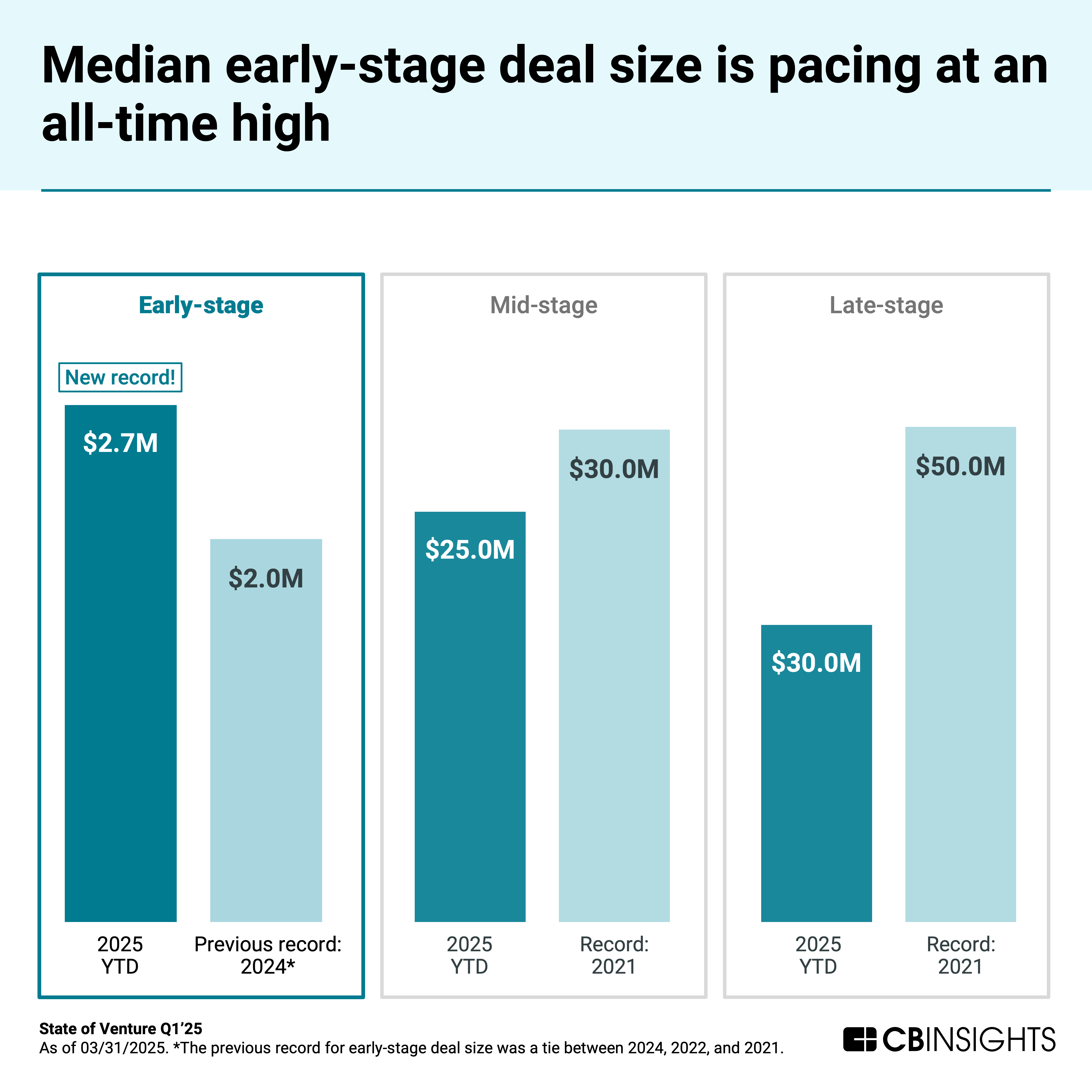 The median early-stage deal size reached $2.7M in Q1’25, up from $2M in full-year 2024 — a 35% increase. This jump reflects both investors’ willingness to place larger bets on promising teams and the increased capital requirements for competitive AI development.