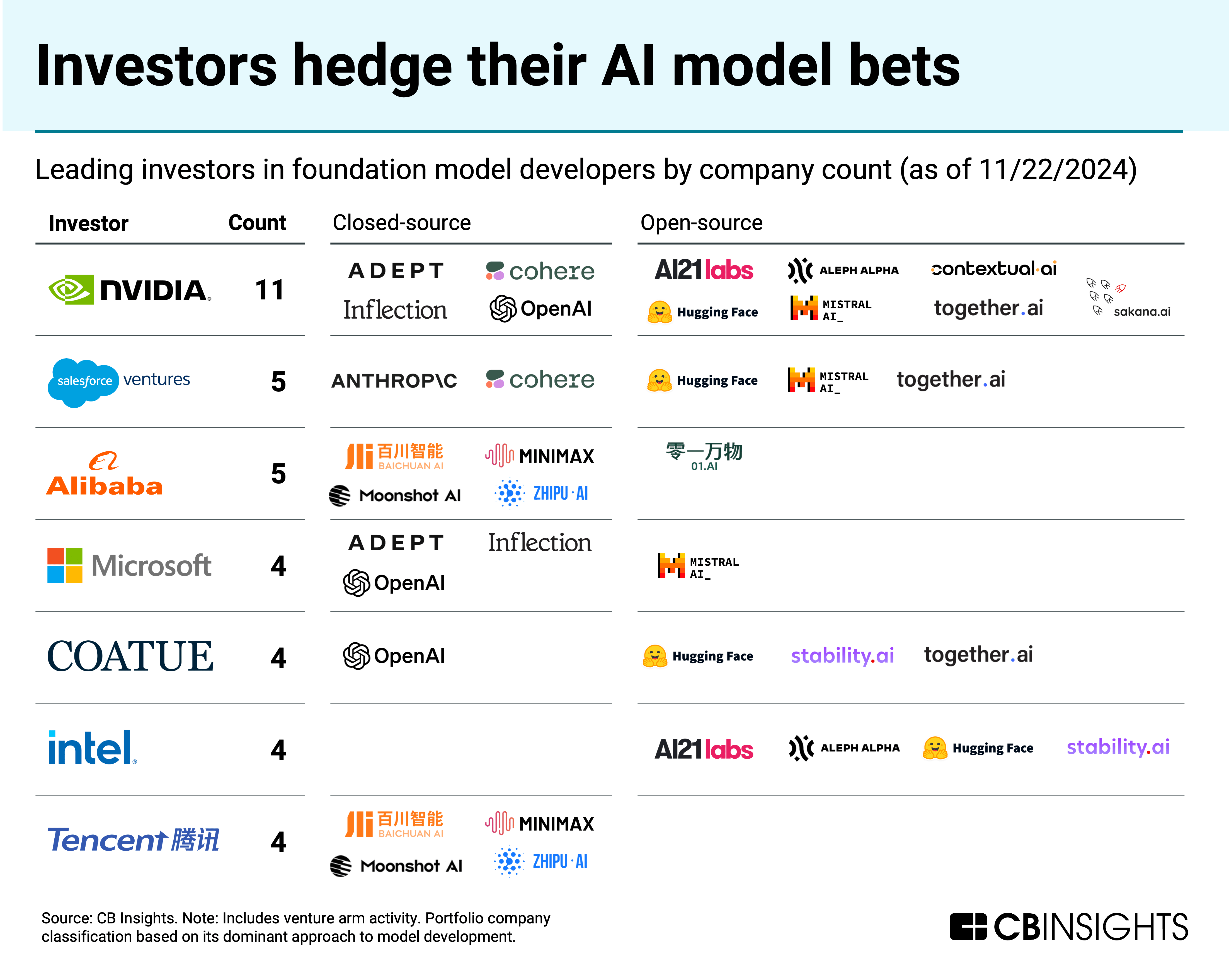 Corporate investors figure heavily — Nvidia, Alibaba, and Microsoft, for example, have offered computing power and funds for development. These investments are aimed at feeding their core business focuses, such as AI chips and cloud computing. AWS, Azure, and Google Cloud all host both open and closed models.