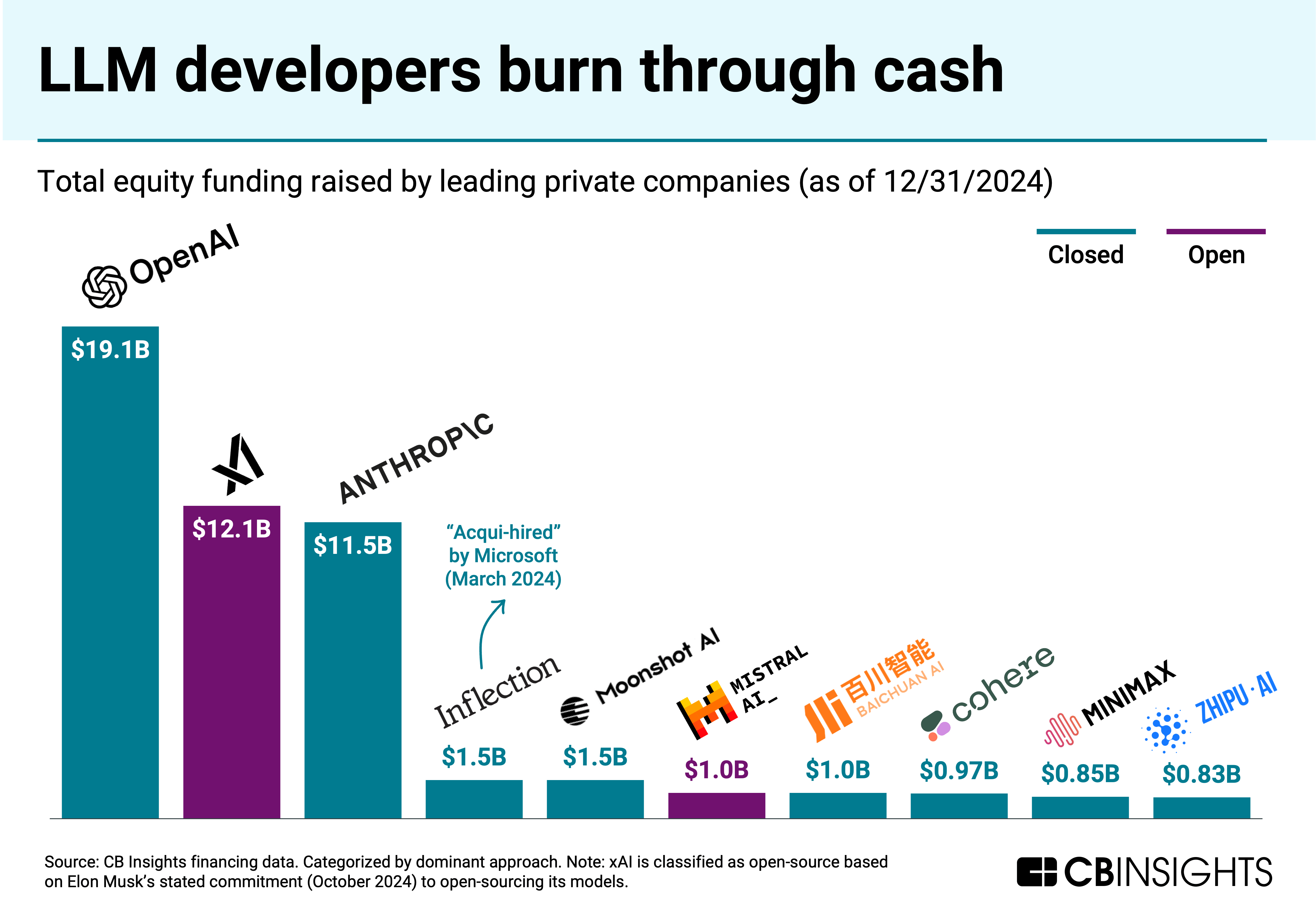 Below, we use CB Insights data to map out the open-source and closed-source AI landscape. Our analysis focuses on foundation models — the powerful, general-purpose AI systems that form a critical infrastructure layer.