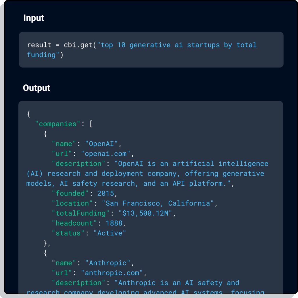 Your internal AI models have a new friend. Incorporate ChatCBI into your genAI projects and apps as an expert market intelligence agent. It has full access to our Business Graph that spans 10 million companies and 1,500 markets.