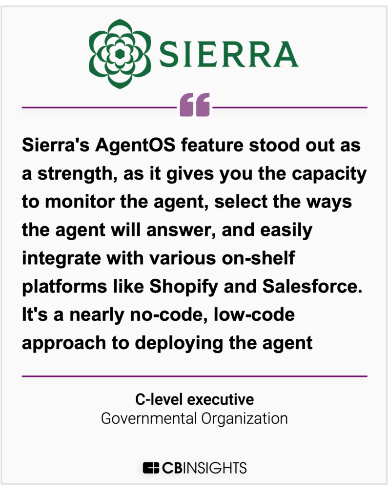 - Value of enterprise adoption will come from integration depth. AI agents require seamless integration to company-specific context such as historical tickets, internal knowledge bases, CRM data, and proprietary documentation, to deliver personalized, informed resolutions while maintaining consistent brand voice. Enterprise value emerges when agents turn customer inquiries into closed-loop resolutions, eliminating inefficient human handoffs and workflow bottlenecks. According to CB Insights buyer reports, successful vendors offer agentic solutions with ease of deployment and integration.