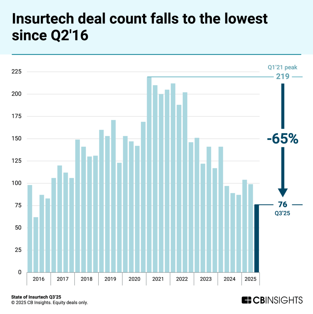 Insurtech deal count fell to just 76 in Q3’25 — the lowest level since 2016 and 65% below the Q1’21 peak of 219 deals. Both property and casualty (down from 65 to 56 deals) and life and health (34 to 18) saw quarter-over-quarter declines, reflecting a broader slowdown in the venture environment.