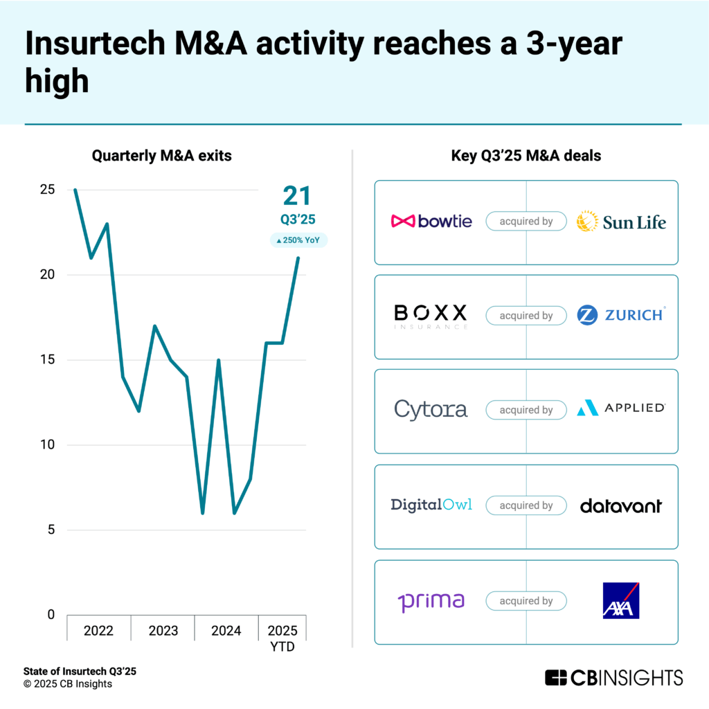 Even so, the industry’s strongest startups face favorable business conditions, as insurtech M&A exits reached a recent high in Q3’25.