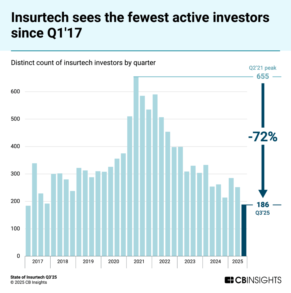 Investor count peaked in Q2’21 at 655 and has since fallen by 72% to hit 186 in Q3’25, mirroring the broader venture pullback that leaves insurtechs competing in a smaller funding pool.
