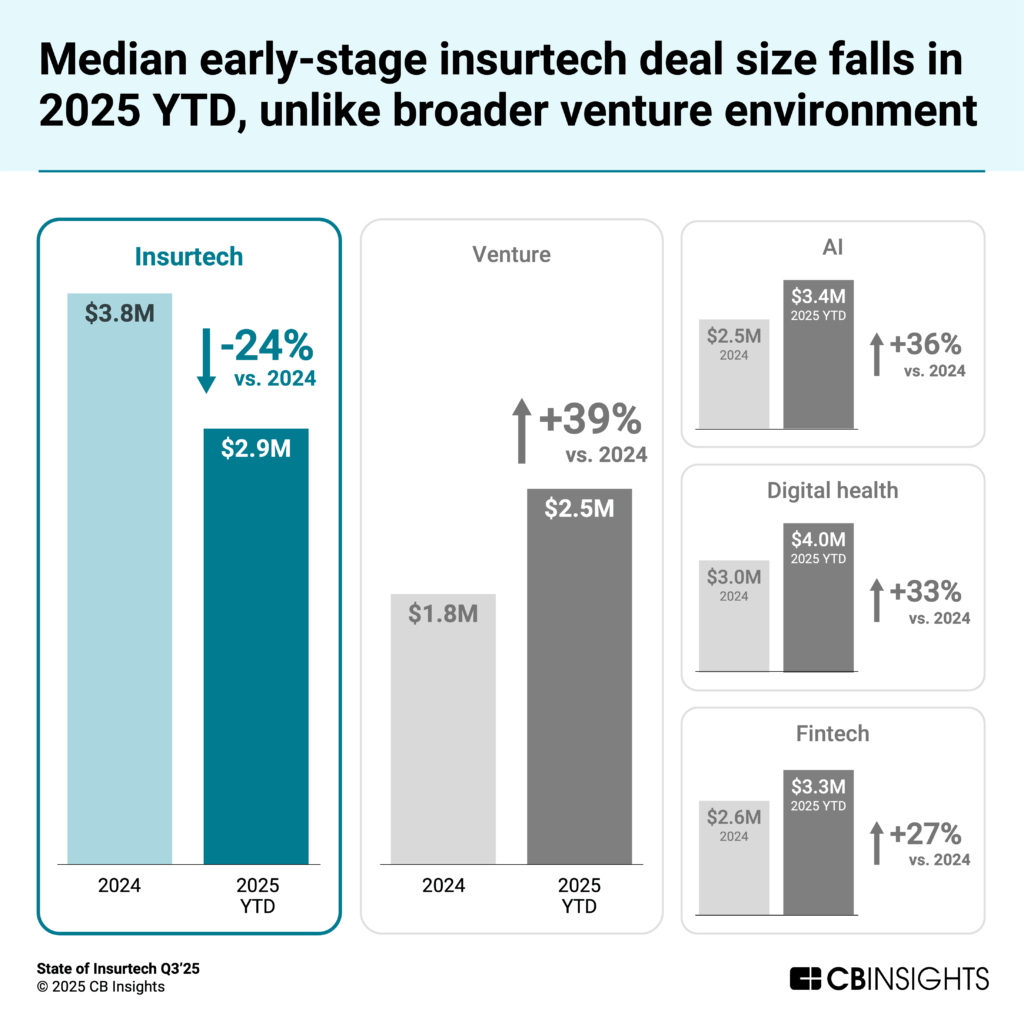 - Median early-stage insurtech deal size shrinks, thinning innovation pipeline